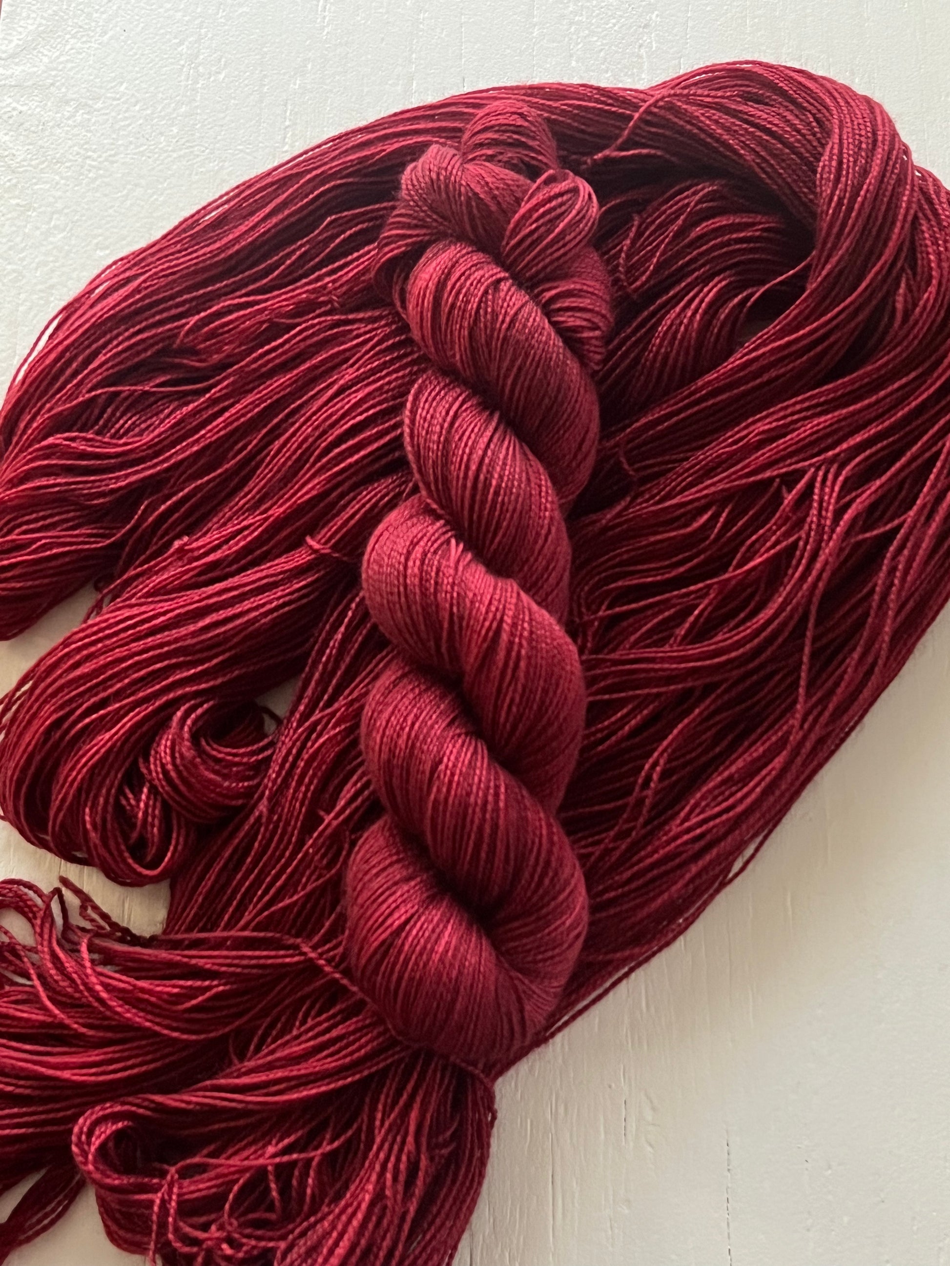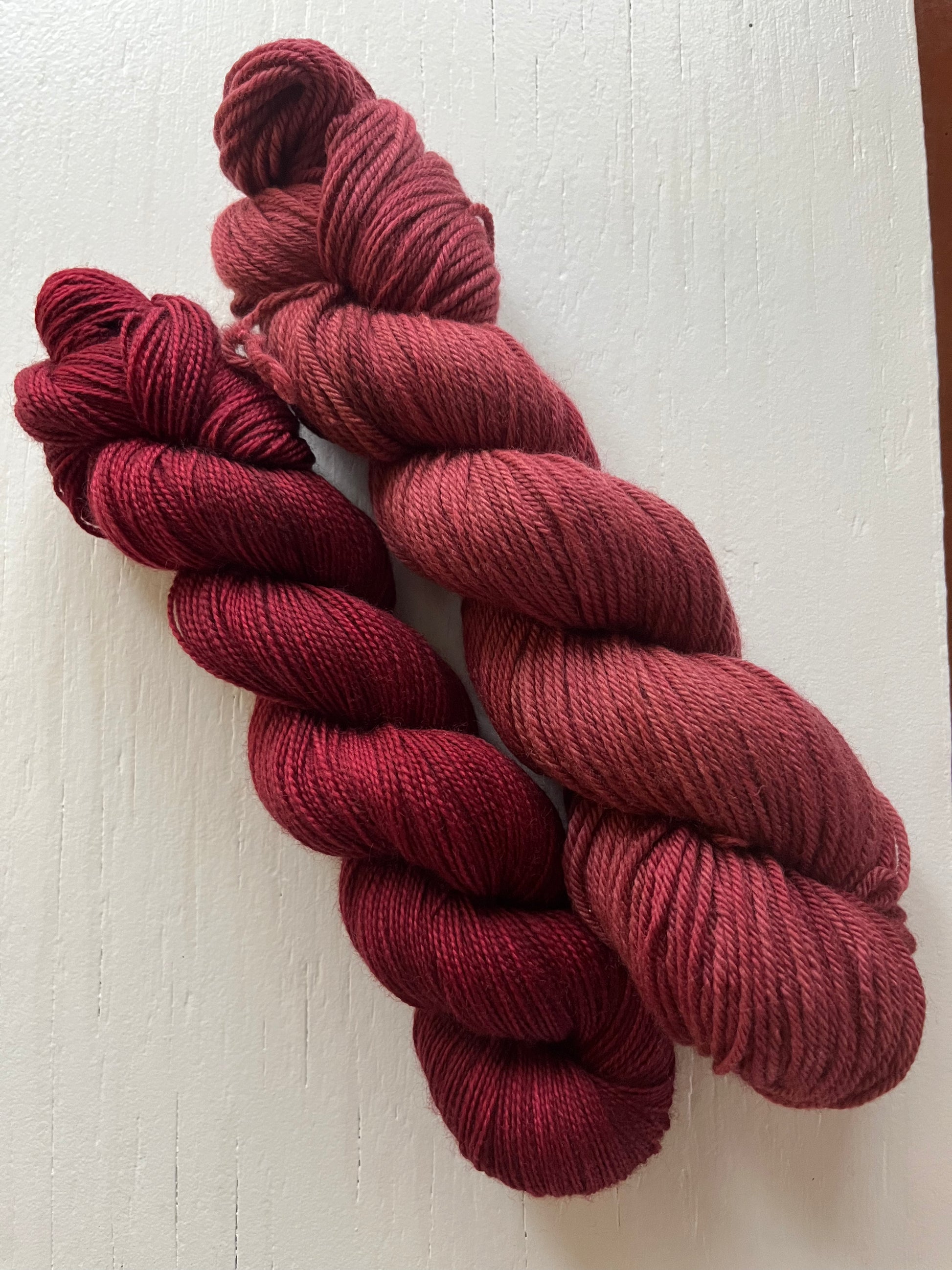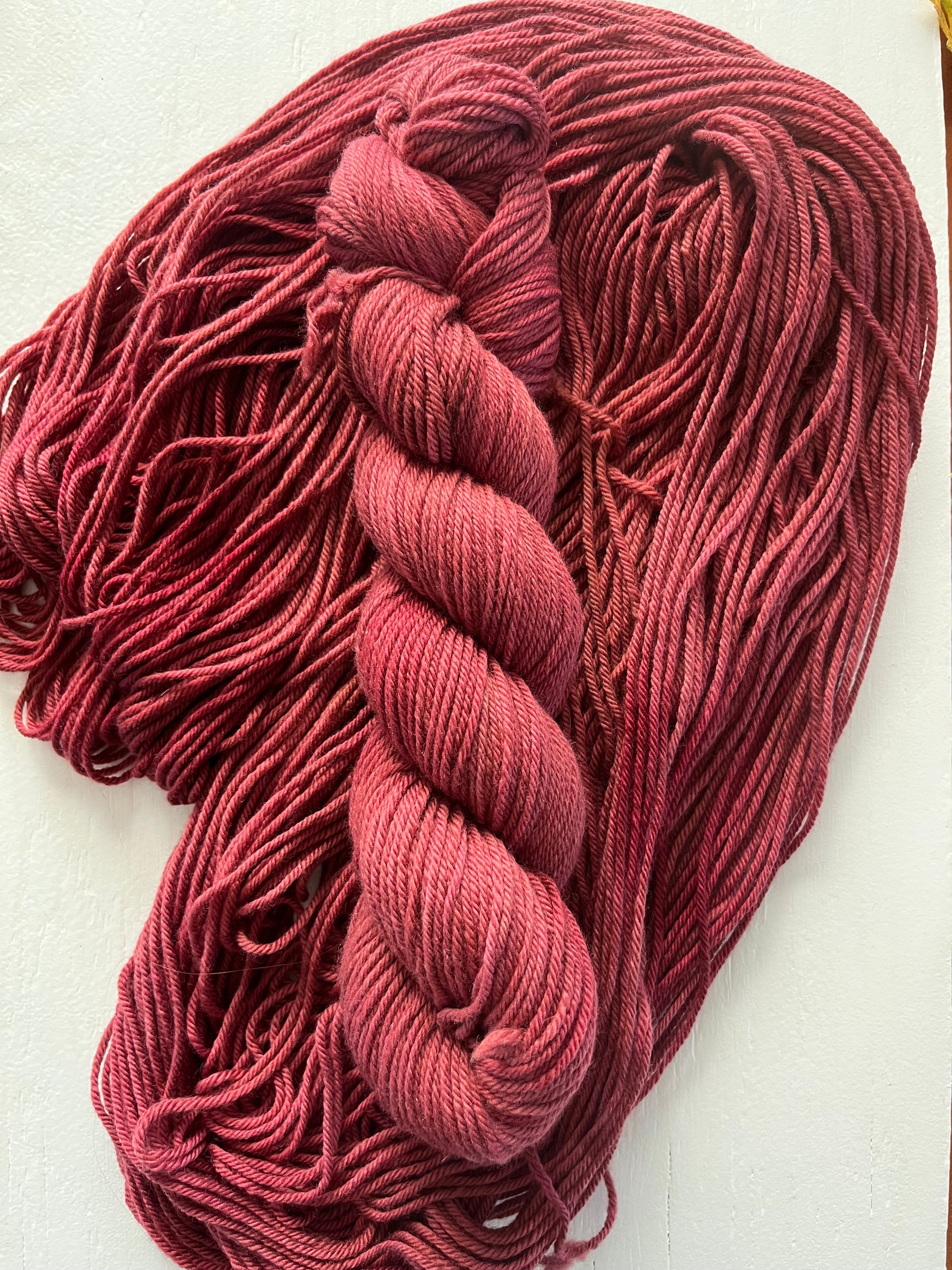 There are huge amounts of blueberry bushes in the cascade mountains. They ripen in the late summer and are SO tasty. There is nothing better than stopping to pick fresh blueberries mid way through a hike. The color here captures the leaves of the bushes as they turn in the fall. The color is a glorious deep pink that would make a beautiful cabled knit or used with another color for some patterns.