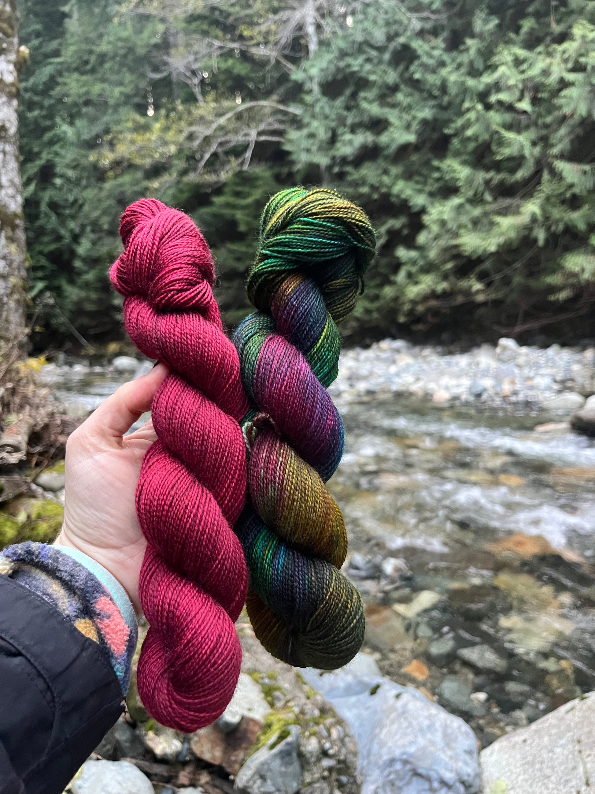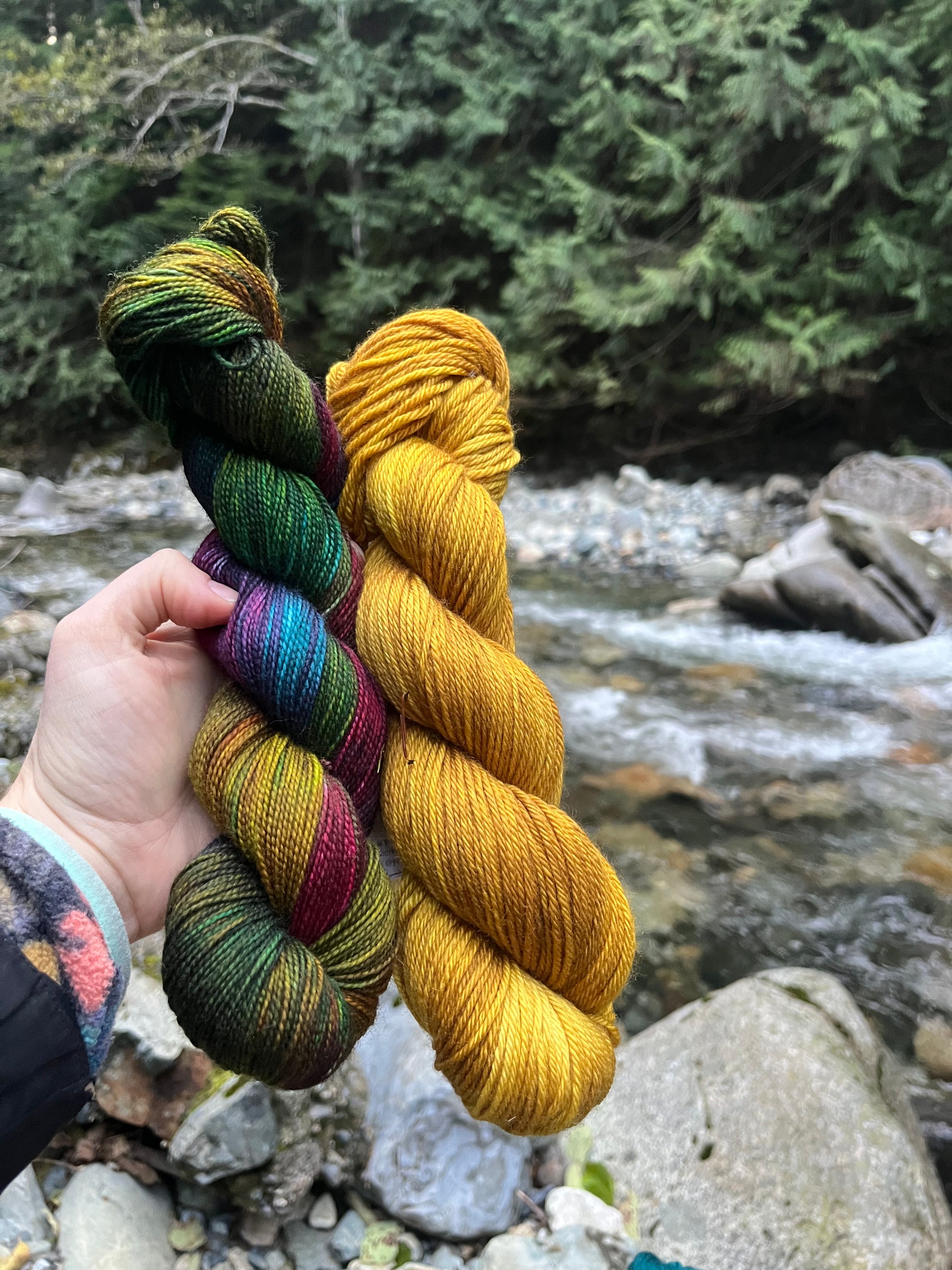 There are few things more beautiful than a high alpine lake in the fall. The blue of the water and the green of the evergreen trees mix with the reds, oranges, and yellows of the changing leaves to make for a plethora of color. This colorway combines all of that in one variegated.