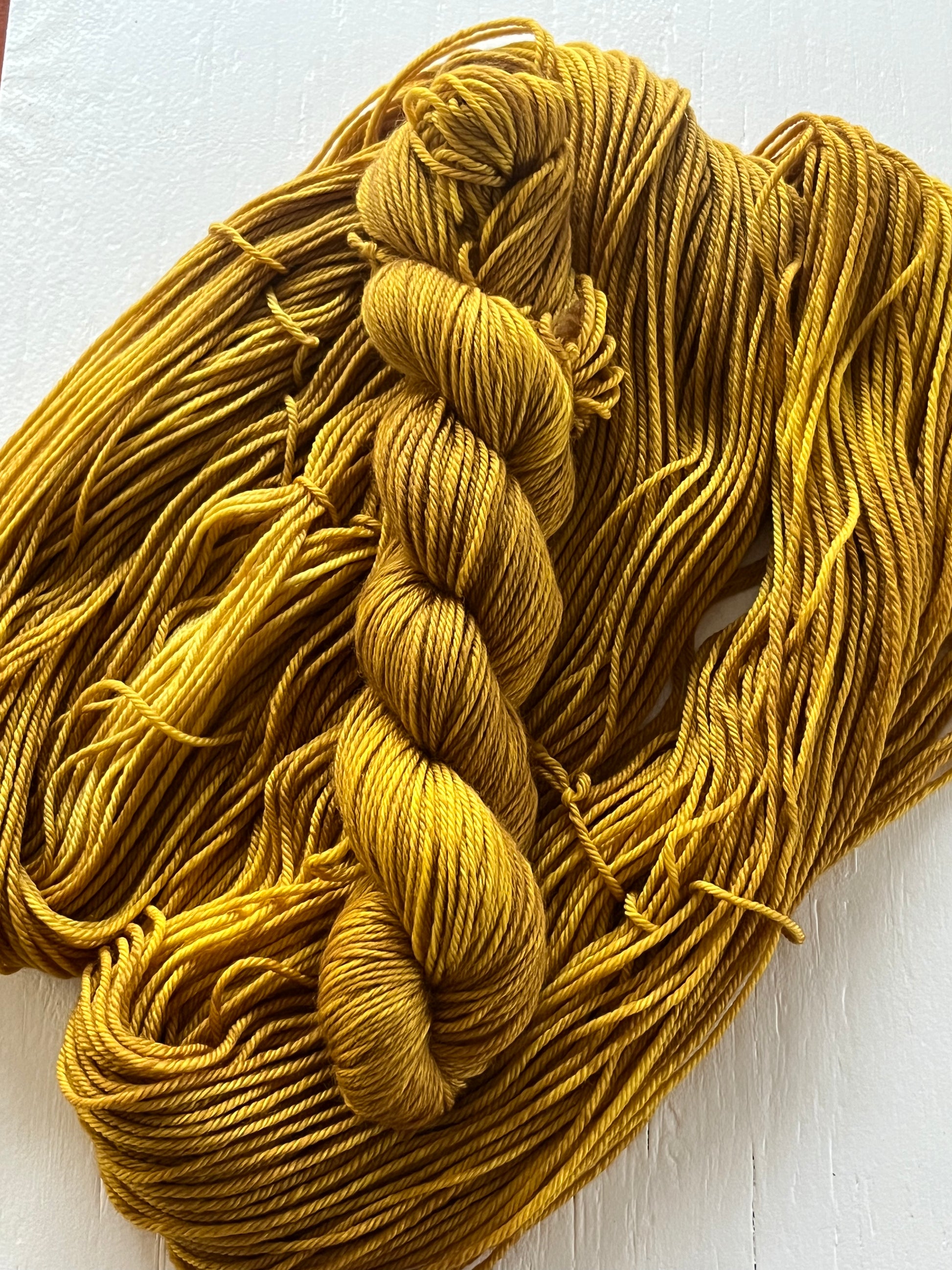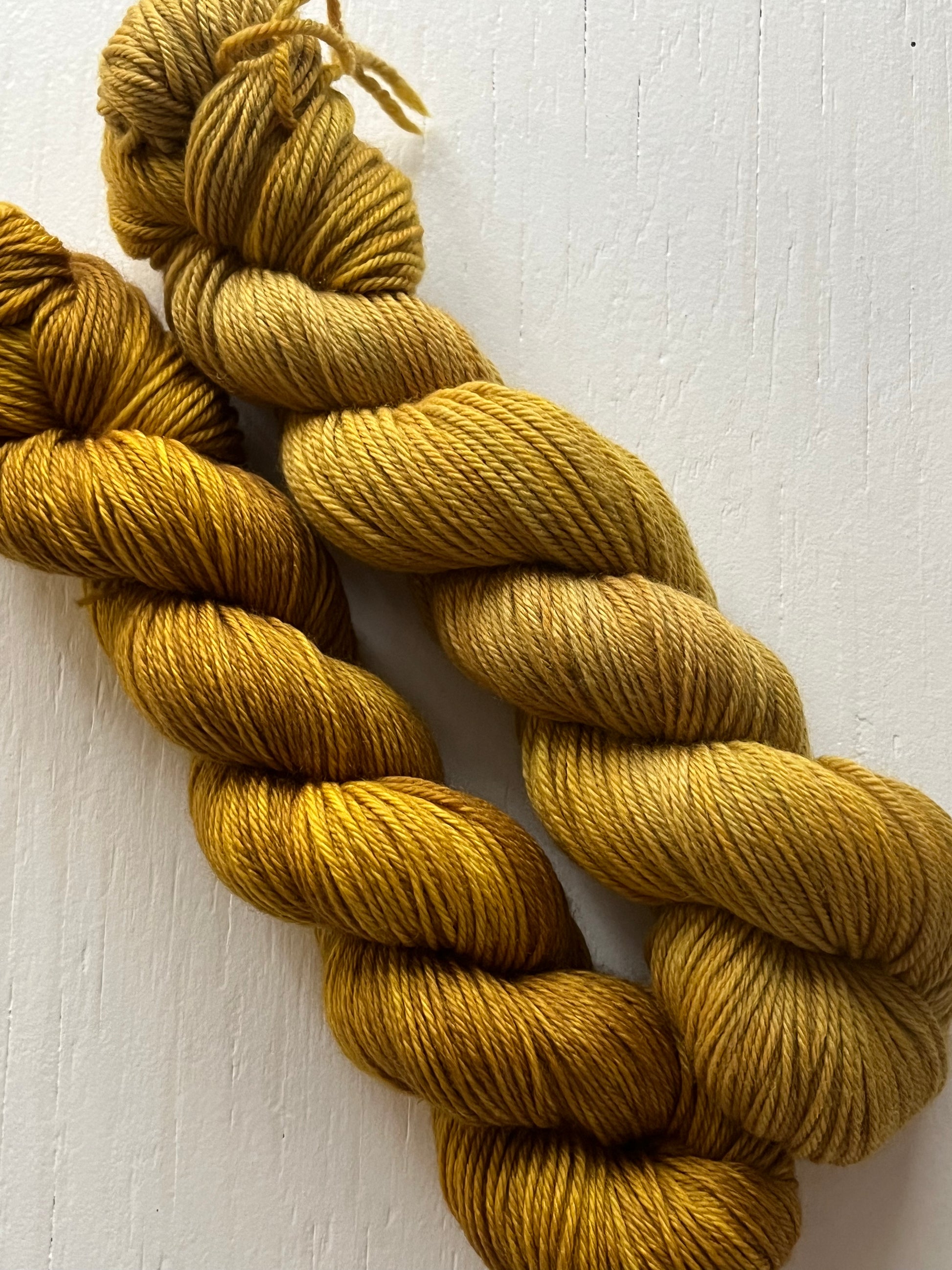 Larches are so cool because they look like evergreen trees, but they change color in the fall like deciduous trees. They turn a glorious golden orange that this colorway attempts to capture.